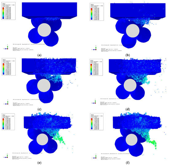 Figure 13 shows the destruction of sea ice during one revolution of the propeller under the condition of ice propeller cutting. The color in the figure represents the damage level of the bond, blue represents the ice material point in an intact state, and red represents the ice material point completely broken. Figure 13a shows the process of cutting ice with the first blade. It can be seen from the color depth of the ice particles that the damage of the ice particles by the particles after the propeller is significantly increased. Because the initial cutting depth of the first blade is small, the resulting ice has a high degree of fragmentation, and the size of the resulting broken ice cubes is small. In the process of ice propeller cutting, the ice block has a forward movement speed, so the depth of the second blade cutting ice block in Figure 13b is obviously increased. The cut ice block is relatively complete and relatively large, as shown in Figure 13c, d. After the third blade, the cutting process of the ice propeller is basically stable, showing periodic cutting. The depth of cut and the size of the crushed ice formed during the cutting process of different blades are similar, as shown in Figure 13e, f. In general, the ice cubes will form grooves after being cut by the propeller. Each time the propeller blades are cutting the ice, the depth of the grooves will increase. Due to the large randomness in the formation of ice cracks in the ice propeller cutting process, the shape of the broken ice is also greatly randomized. This is affected by many factors such as the shape and operating speed of the propeller, the characteristics of the propeller, and the characteristics of the sea ice itself. The broken ice will be accelerated by the cutting action of the propeller and will be thrown by the blades behind the cutting blade at a high speed. It is likely to hit the stern structure of the hull, causing ice-induced vibration of the hull or instantaneous high stress on the bottom of the ship, which has a great impact on the ship structure. The design and research and development of ships in ice areas requires special attention to this point.