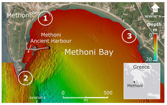 - Gkionis, P.; Papatheodorou, G.; Geraga, M.; Fakiris, E.; Christodoulou, D.; Tranaka, K. A marine geoarchaeological investigation for the cultural anthesis and the sustainable growth of Methoni, Greece. J. Cult. Herit. 2019, 42, 158–170. [Google Scholar] [CrossRef]