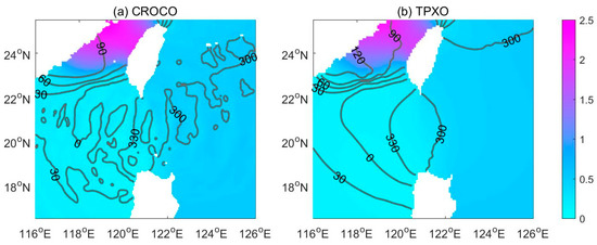 where A and G denote the M2 barotropic tide amplitudes and phases, respectively, and the subscripts T and C represent results from TPXO7.2 and CROCO, respectively. The domain-averaged error is 4.7 cm, confirming the accuracy of the model output. The most obvious differences between the two co-tidal charts are small-scale fluctuations superposed on the co-phase lines in Figure 2a, which are actually the modulation of ITs to barotropic tides [5,8,32].