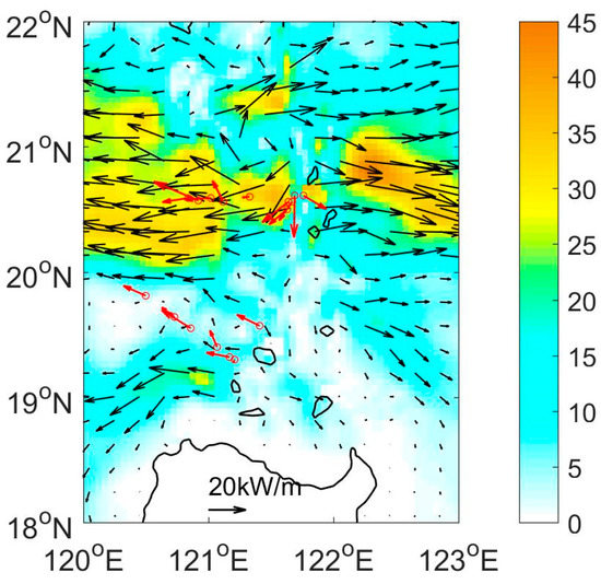 Simulated (black arrows) and observed (red arrows) semidiurnal energy flux at the LS. The magnitude of the energy flux is indicated by shading (unit: kW/m).