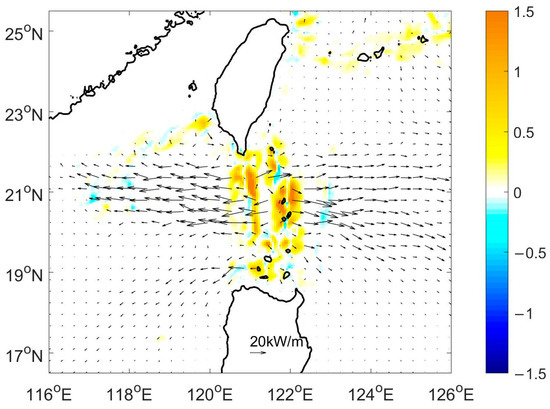 To validate the compacity of the model for the IT simulation, we ran an extra case forced by the S2 tide. The model setting was the same as that forced by the M2 tide. The semidiurnal energy flux (M2 + S2) was calculated and compared with in situ observations from [33] (Figure 3). At most stations along the northern and stronger beam of the westward-propagating IT, the magnitude and direction of the model results agree well with the observations, while the simulated ITs are slightly weaker than the observations in the southern part of the LS. The deviation is probably caused by the spatially varying stratification and subtidal background currents (e.g., the mesoscale eddies and the Kuroshio) [8,22], which are not considered in this study.