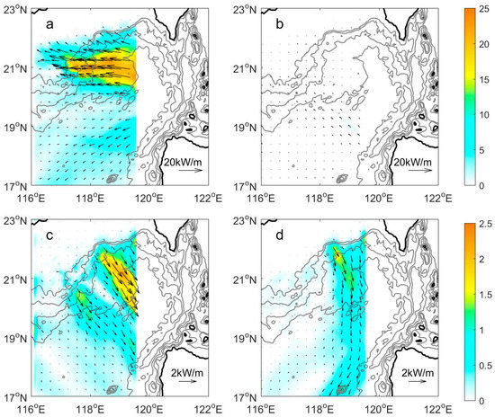 Depth integrated energy flux of the (a,b) westward, and (c,d) southward components in (a,c) the Full case and (b,c) the Slope case. The shadings indicate the magnitude (unit: kW/m) and the arrows show the directions. The gray lines indicate isobathic contours of −3000, −2000, −1000, and −500 m.