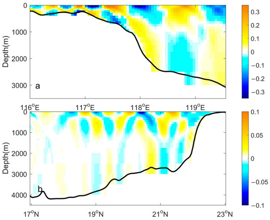 Snapshots of (a) the zonal baroclinic currents along 21° N and (b) the meridional baroclinic currents along 119° E (shading, unit: m/s) at the end of the simulation.