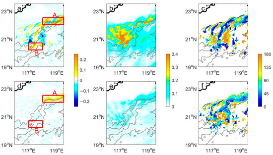 Figure 7a,d show the M2 conversion rate in the two cases. The pattern of the Slope case is quite simple: only one area (118°–119.5°, 22°–22.5° N, denoted as A) shows a relatively large conversion from barotropic to baroclinic tides. The integrated conversion around region A is 0.32 GW. On the contrary, in the Full case the positive values for conversion rate alternate with negative values; in other words, the areas where ITs are generated alternate with those where energy transfers from ITs into barotropic tides. This pattern indicates the complicated influence of the remotely generated ITs. The integrated conversion around region A is 0.42 GW, up by 31% from the Slope case, although some areas within region A show a negative conversion rate. Corresponding to the southern branch of the M2 southward component, region B (117°–118°, 20.2°–20.7° N) was identified and its integrated conversion amounts to 0.13 GW.