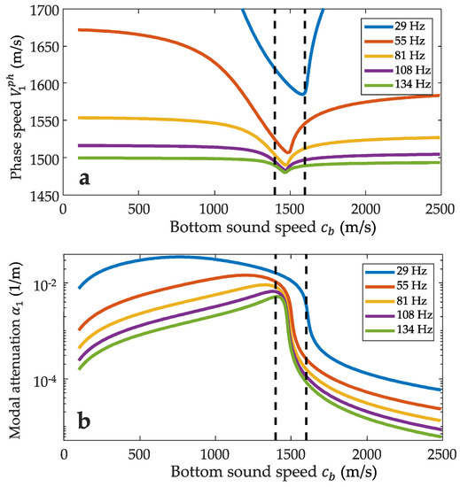Dependence of (a) the modal phase speed and (b) attenuation on the sound speed in the bottom for the first mode at different frequencies. Vertical dashed lines limit the transitional region under consideration.