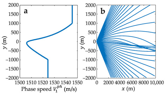 (a) Modal phase speed profile along the y-axis for the first mode at a frequency of 55 Hz and (b) the corresponding modal rays in the horizontal plane.