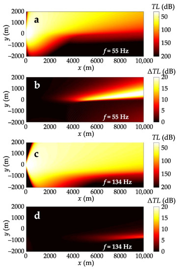 In the multimodal regime at higher frequencies, the effect of horizontal refraction weakens for the first mode, but can still be exhibited in the acoustic field of other modes. However, the amplitudes of those modes are attenuated with range more rapidly than the amplitude of the first mode. Figure 4c shows the 2-D transmission loss at 134 Hz, at which the acoustic field is effectively formed by the first three normal modes. Owing to the dominance of the first mode in the full field, the maximum difference in propagation loss between the three-dimensional case and the N × 2-D approximation does not exceed 12 dB at 10-km range (see Figure 4d). Additional calculations for other positions of the sound source along the y-axis show that the transmission loss difference decreases to 6 dB, if the source is shifted by ±500 m relative to the initial location.