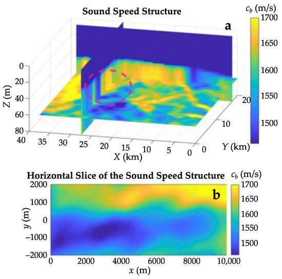 An example of a shallow-water waveguide with an inhomogeneous bottom and almost constant water depth is presented in Figure 5, which shows the sound speed structure in one of the regions of the Kara Sea. This complicated range- and depth-dependent structure is obtained by the velocity analysis of 3-D seismic survey data [11]. To study three-dimensional acoustic effects, we choose a rectangular area of the bottom, marked in Figure 5a by the dashed ellipse and shown separately in Figure 5b. The selected area is characterized by strong horizontal gradients of the sound speed in the seabed. The water depth there is equal to 28 m over the whole area.