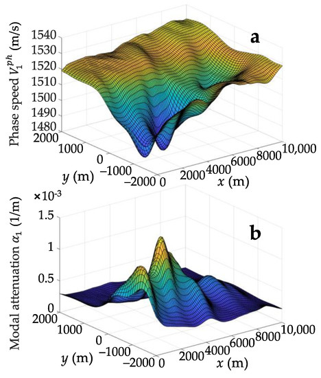 Figure 6 shows the distributions of the phase speed and attenuation coefficient of the first mode at a frequency of 55 Hz in the selected region. One can see a strong variability of the modal phase speed in the zone of a low sound speed in the seabed, −2000 m < y < 0 m. The maximum phase speed gradient is equal to 0.06 (m/s)/m. The same zone is also characterized by the largest values of modal attenuation (up to 1.5 × 10−3 1/m or 13 dB/km).