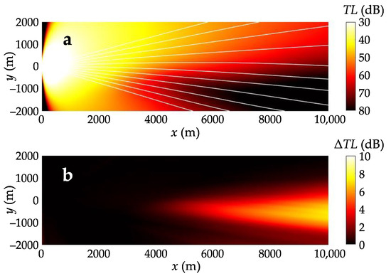 The presence of a canyon-like distribution of the phase speed shown in Figure 6a, leads to the effect of horizontal refraction, which is demonstrated in Figure 7 for a 55-Hz sound source located at (0, 0, 15 m). As in the case of the idealized waveguide model, we note the curvature of modal rays in the horizontal plane (the modal rays are depicted by white lines in Figure 7a). The maximum angle of refraction is 6°. The maximum difference in the transmission loss between the mode parabolic equation solution and N × 2-D solution, is observed in the zone of a low sound speed in the sediments, and equals to 7 dB. If the sound source is moved along the y-axis to the point (0, −1000 m, 15 m), which is in the middle of the “canyon”, the transmission loss difference increases up to 10 dB. The corresponding results at 134 Hz show the maximum difference of 4 dB. The main factor leading to the decrease of in the real simulation with respect to the simplified model is that the modal phase speed gradient is not constant along the x-axis, and its mean value is less than that in the idealized waveguide.