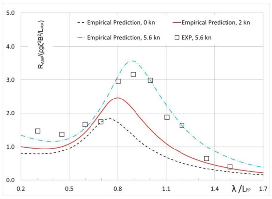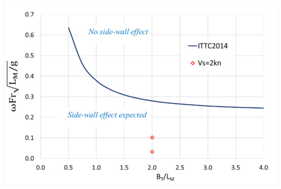 The guideline also permits experiments to be conducted in regular waves. As numerical methods are already recommended, experiments are required only when a design does not pass the assessment using available methods, which will be a very challenging scenario. This can be due to a very innovative design, so that existing empirical methods do not accurately capture the added resistance, and experiments are expected to provide some gain. It may also be due to the selection of a relatively small engine. However, the execution of tank tests at low speeds is not an easy task. Technically, added resistance in waves is obtained by measuring the still-water resistance at speeds of interest and the resistance in waves at the same speeds, and finding the difference between them [20]. For both resistance and seakeeping tests, the setup of the tests must be carefully designed to avoid significant blockage or tank wall effect [21,22]. These requirements are not easy to meet. Figure 4 shows the two points corresponding to λ/LPP = 0.2 and λ/LPP = 2.0 regular wave condition of a 5 m long model to be tested at 2 knots for the seakeeping experiments in a 10 m wide tank. Apparently, these points are well below the ITTC recommended boundary for avoiding tank wall effect. The tank wall effect during measuring added resistance at low speeds has been well reported [7,23]. Besides, as shown in Figure 3, for the spectrum with Tp = 9 s, most of the contribution is from relatively short waves, where the target measured value is rather small and much uncertainty is involved in the experiments [24,25]. The error may lead to significant difference in dimensional values. Lastly, if only head wave tests are conducted and the mean wave added resistance value is calculated in long-crested head waves, then a factor of 1.3 should be multiplied to the result value. This is rather conservative, thus is not expected to provide much “gain” to the designer. When conducting testing in various headings, extensive resources must be allocated, and the cost can be rather high.