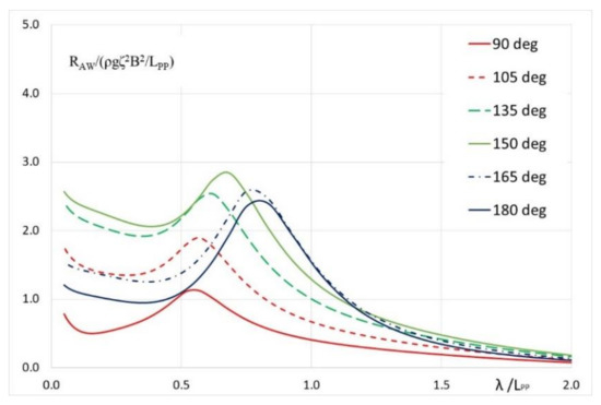 Figure 2 shows the predicted added resistance of the VLCC design in regular waves of various directions at 2 knots, which follows the newly amended guidelines. From this graph, it is observed that the maximum of the wave added resistance responses does not correspond to the head wave direction (180 deg case), which is in line with the guidelines (Article 18).