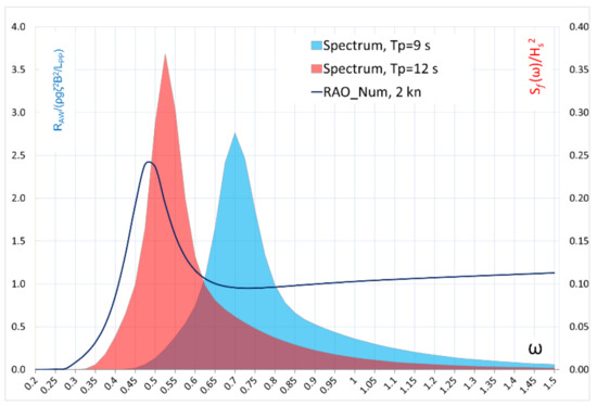 Figure 3 shows the transfer functions of the added resistance in regular head waves of the ship at 2 knots plotted against 2 JONSWAP spectra of unit significant wave height but of different peak periods. When these quantities are plotted against wave frequency, the importance of the prediction of the added resistance in short regular waves (high-frequency region) for estimating the total mean added resistance in seaways represented by a spectrum is clearly demonstrated, particularly for smaller peak frequency. The contribution of relatively short, or higher frequency waves, is very important for the accurate prediction of the mean added resistance in a seaway, as discussed by Minsaas et al. [17], Liu and Papanikolaou [18], and Liu et al. [19], particularly for this low-speed problem, where the resonance is shifted to higher frequency region, when compared with the problem at service/design speed.