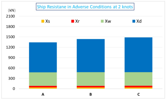 Components of the total resistance of the VLCC design at 2 knots in adverse conditions as defined by the IMO Guideline.