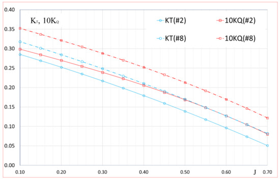 Figure 7 above shows the open-water characteristics of the two candidate propellers. For the required thrust T, the operational point of the propeller can be read off from the or be determined by plotting the parabolas into the open-water characteristics and finding the intersect.