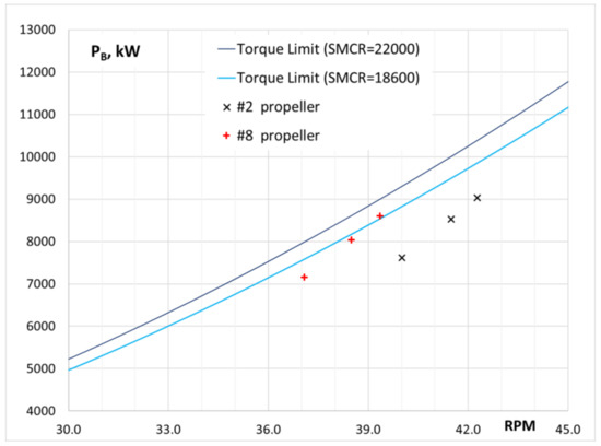 Finally, the required engine power and speed using two candidate propellers can be calculated, as shown in above Table 4 and Table 5. These operational points are plotted in Figure 8, together with torque limit of the selected engines [26]. When using #2 propeller, the three operational points, obtained using alternative methods, are below the torque limit of both engines. When using #8 propeller, the three operational points are below the torque limit of the larger engine but are rather close to the torque limit of the smaller engine. Subsequently, the larger engine is preferred if #8 propeller is used.