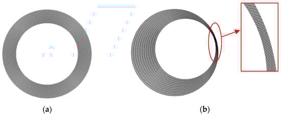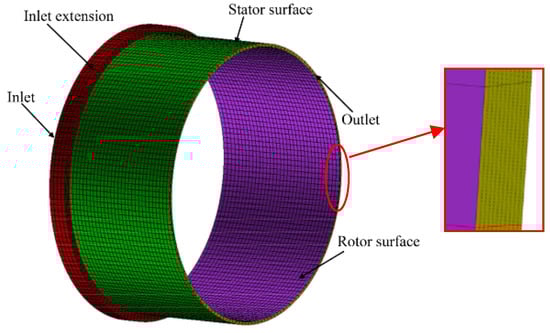 The grid displacements of the annular seal are calculated through the mesh morphing procedure to guarantee the harmony of the movement of adjacent grid nodes. To test the feasibility of the algorithm, the rotor is whirled from the concentric state (Figure 5a) to a state with an eccentricity of 0.8 (Figure 5b), and it is found that the grid distortion becomes larger, but there exist no highly distorted grid cells and negative volumes. For the mesh morphing technique, the amount of change in the coordinate of the node in the gap is inversely proportional to the distance from the rotor to control the minimum distortion of the mesh during the whirl []. The connections between the nodes are similar to springs, and the number of nodes and the connection properties between the nodes remain unchanged at each time step. Due to rotor whirling, the grid cells on one side are compressed, and the cells on the other side are stretched, resulting in an increase in the maximum length–width ratio q on the basis of concentric position, which decreases the grid quality. When the annular seal possesses an eccentricity of 0.8, the maximum of length–width ratio is no more than 200 based on q = q0/(1 − εe) []. Therefore, the mesh morphing technique is appropriate for transient numerical calculations of eccentric annular seals.