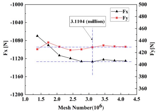 The annular seal studied in this paper is based on Marquette’s experimental model [], which is a liquid annular seal having the characteristic of smooth walls. The main geometrical dimensions and working conditions of the annular seal are listed in Table 1. The whole fluid domain of the annular seal is divided into hexahedral grids, as shown in Figure 1. The grid independence is analyzed by comparing the fluid response forces under different grid densities. As illustrated in Figure 2, when the number of grids is increased to 3.1104 million, the fluid response forces Fx and Fy nearly remain constant. Thus, the present grid number of 3.1104 million is selected for further numerical calculations.