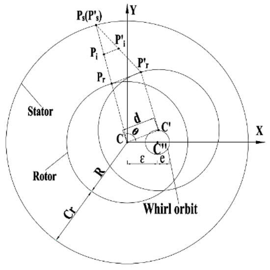 When the rotor moves, the nodes on the stator surface remain stationary and the movement displacements of the nodes in the clearance are determined by interpolation algorithm []. Subsequently, the coordinates (xi′, yi′) of P′i in the clearance are achieved as shown in Equation (7).