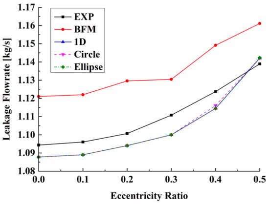 Figure 6 presents a comparison of the leakage flowrates predicted by the transient CFD method based on three whirl models with the bulk flow model results and the experimental results []. In the present simulations, the whirl amplitude is determined as 1% of Cr. The leakage flowrates from the 1D whirl model, circular whirl model and elliptical whirl model are almost the same. The maximum error of the transient simulation is 0.97%, which is lower than that of the bulk flow model. As shown in the figure, the leakage flowrates of the experiment increase slightly as static eccentricity increases. The variation trend of the transient CFD simulation method is more consistent with the experimental one than the trend of the bulk flow model is. Therefore, the transient CFD method is more applicable for predicting the leakage flowrates of annular seals.