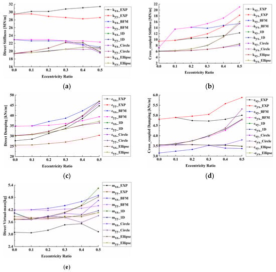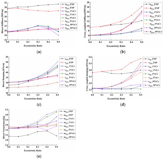 Dynamic characteristics of the seal under different whirl amplitudes: (a) direct stiffness; (b) cross-coupled stiffness; (c) direct damping; (d) cross-coupled damping; (e) direct virtual-mass.