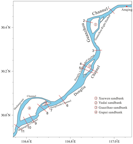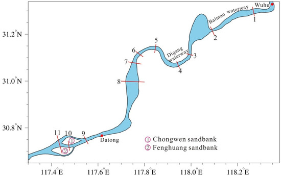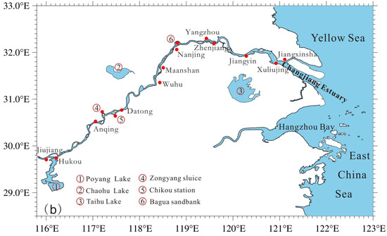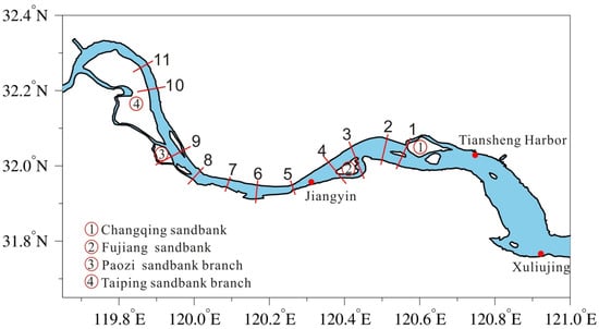 The Changjiang River, also known as the Yangtze River, is one of the largest rivers in the world, emptying 9.32 × 1011 m3 of fresh water annually into the East China Sea. The Changjiang’s estuary has a 90 km wide river mouth and is characterized by multiple bifurcations (Figure 1). River discharge is recorded at the Datong hydrological station, which is located 620 km from the mouth of the Changjiang River. River discharge exhibits pronounced seasonal variations, with the lowest monthly mean value of 11,700 m3 s−1 in January and the highest monthly mean value of 49,900 m3 s−1 in July (Changjiang Water Resources Commission, based on data from 1950 to 2020). The tides in the estuary exhibit semidiurnal, diurnal and fortnightly spring–neap signals and are the most energetic source of water movement in the Changjiang’s estuary [6]. During spring tide, the amplitude of the tidal level near the river mouth is mostly greater than 4.5 m and is approximately twice that during neap tide, which has a typical value of less than 2.2 m. The strong tidal range introduces a tidal current and tidal level in the river. For a long time, the common understanding of the tidal current limit and tidal level limit in the Changjiang’s estuary was that the tidal current limit was roughly located in Jiangyin, while the tidal level limit was located near the Datong hydrological station [7]. By the analysis of historical data, Chen et al. [8] reported that the tidal level limit in the Changjiang River moved down from Jiujiang, Jiangxi Province, in the Jin Dynasty to the current position of Datong, Anhui Province, in the dry season, while the tidal current limit moved down from Yangzhou to the vicinity of Jiangyin in the flood season. Xu and Liu [9] analyzed long-term measured data from hydrological stations in the lower reaches of the Changjiang River and noted that the average position of the tidal level limit was 50 km downstream of Datong station, while the average position of the tidal current limit was located in Jiangyin. However, some researchers noted that the two limits were not fixed locations. Song [10] indicated that the location of the tidal current limit changed significantly with river discharge variation in the flood and dry seasons. Shi et al. [11] further refined the tidal level limit and showed that, when the river discharge at Jiujiang station was only 8440 , the tidal level limit was near Jiujiang station, while, when the river discharge at Jiujiang station reached 66,700 in the flood season, the tidal level limit was located between Zongyang sluice and Chikou station.