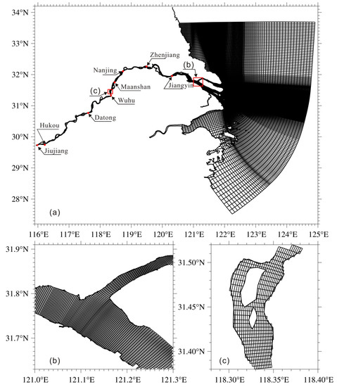 Model domain and grid (a), enlarged views of the model grid at the bifurcation between the North Branch and South Branch (b) and in the river near Wuhu (c).
