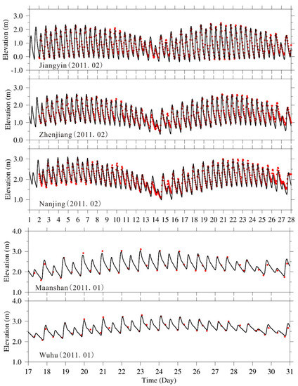 Temporal variation in the water level at the hydrological stations in the lower reaches of the Changjiang River. The red dots are the measured values and the black lines are the modeled values.
