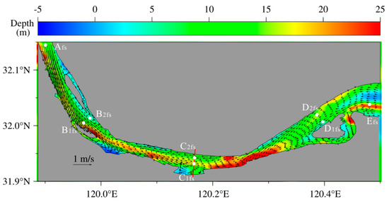 The current in the lower reaches of the Changjiang River is determined by river discharge and tidal current. The farthest distance from the river mouth to which the tidal flood current can reach in the river is related to the tidal range; therefore, there is only one tidal current limit at a given river discharge. Our purpose is to determine the farthest distance the tidal flood current could reach, i.e., the tidal current limit. As an example, we analyzed the characteristics of the surface current in the tidal reaches of the Changjiang River with a river discharge of 48,161 corresponding to a guarantee rate of 50% of the hydrological frequency in the flood season (July) as the typical river discharge (Figure 4). At site Afs, the current is seaward and the flood current cannot reach there at that moment. At sites B1fs and B2fs, the current is seaward and has a larger speed in the southern deep channel than in the northern shallow channel. At sites C1fs and C2fs, there is no flood current in the southern deep channel, while a flood current appears in the northern shallow channel. At sites D1fs and D2fs, the current, called the flood current, is landward and has a larger speed in the southern shallow channel than in the northern deep channel. At site Efs in the deep channel, there is flood current. The instantaneous current distribution is obviously different between the main channel and on the shoal and between the main channel and tributary. The current is also different in the vertical direction (figure of bottom current omitted). Therefore, for simplicity, to determine the tidal current limit, we had to first determine the position where the instantaneous cross-sectional water flux at each time step was zero, which varied with tide (neap-spring tide); then, we had to determine the farthest one under a given river discharge.