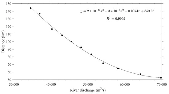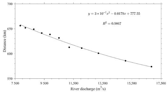 In the dry season, similar to the flood season, the relationship between the tidal level limit and river discharge is nonlinear. Figure 11 shows the quantitative relationship between the tidal level limit and river discharge. By curve fitting the corresponding relationship between the tidal level limit and river discharge, the quadratic function relation was obtained as , where is the river discharge (m3/s), is the distance from the tidal level limit to Xuliujing (km) and R2 reached 0.9867.