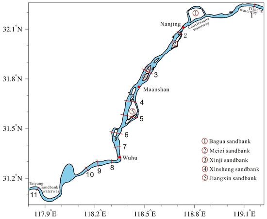 Tidal level limits under various guarantee rates of river discharge in the Changjiang River’s estuary in the flood season. The locations of sections 1–11 are the tidal current limits corresponding to the guarantee rates of 5–95% of river discharge.
