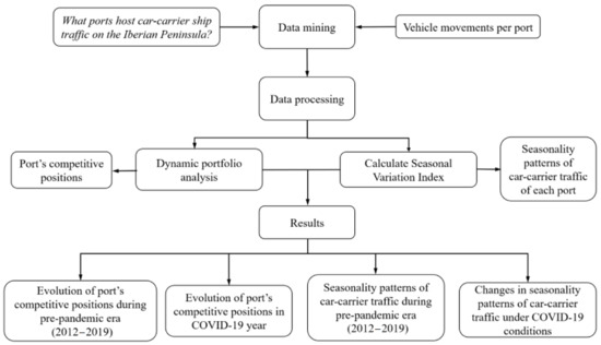 A detailed description of the methodology used can be shown in Figure 2. This chart shows how the research is conducted. First of all, an analysis of the number of ports on the Iberian Peninsula hosting car-carrier traffic should be carried out. Then, data mining and processing are performed, using the number of vehicle movements per port. These steps let us to accomplish a dynamic portfolio analysis and the calculation of SVI. As a consequence of previous computations, some results are derived: the port’s competitive positions and the seasonality patterns of this maritime traffic. Finally, some conclusions are obtained from the data computed, for instance, the evolution of competitive positions and the changes in seasonality patterns of car-carrier traffic.