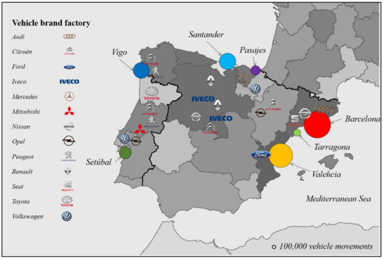 The total vehicle movement throughput of each port is composed of import and ex-port flows. Regarding the export traffic, there is a direct link between the vehicle production factories located in Portugal and Spain and the port through which they export part of their production. That is, if the factory is placed in the hinterland of the port that runs as a gate for vehicle exportation. Figure 3 shows the locations of vehicle factories on the Iberian Peninsula and the seven ports with PCC/PCTC ship traffic. Moreover, the port terminals used to export vehicles also have the role of gateways for import traffic of vehicles that are produced abroad.