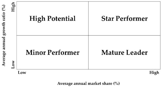 Fleisher and Bensoussan [29] defined the competitive position of an organization as the position of an organization compared to its competitors in the same market or industry. Therefore, an analysis of competitive positions of a set of ports will enable port authority managers to gain insights into the structure of the traffic flows as well as their port’s past performance in comparison with their competitors. There are several methods to measure and identify the competitive position of a set of ports, among which the growth-market share matrix or Boston Consulting Group (BCG) matrix stands out. This matrix is divided into four quadrants, each of which corresponds to a market position, see Figure 4. For the period analyzed, the border on the X axis is defined by the average market share and the border in the Y axis is defined by the average growth rate of all the ports analyzed.