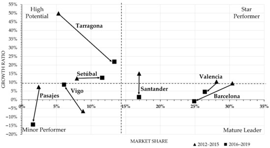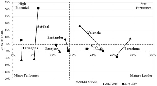 Figure 6 shows the results of the competitive positions for vehicle disembarking traffic. The ports of Barcelona, Santander and Valencia have evolved from the position of star performer to mature leader. Santander has changed its position mainly due to a decrease in its growth ratio. In the case of the ports of Valencia and Barcelona the change was due to both a decrease in the market share and a decrease in the growth ratio. The ports of Setubal and Tarragona remained in the position of high potential during the two periods, although with a significant growth in the market share during the period from 2016 to 2019. Finally, the ports of Pasajes and Vigo remained as a minor performer during the two periods analyzed. Pasajes registered a huge drop in the market share during the 2016–2019 period. Regarding the port of Vigo, during the period 2016–2019 registered an average growth of 8.7%, which positioned it close to the border of high potential quadrant.