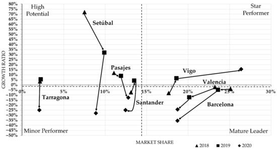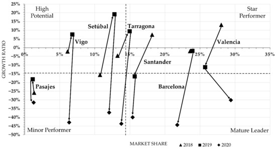 This methodology has been applied in numerous research works devoted to container ports [32,33,34]. However, there are few works that apply the growth–market share matrix to ports with PCC/PCTC ship traffic [35]. This work is pioneering in the application of this methodology to determine the competitive positions of ports of the Iberian Peninsula with PCC/PCTC ship traffic.