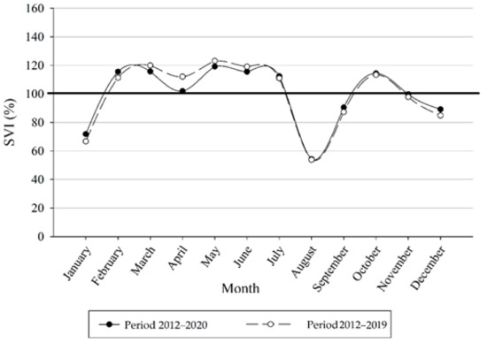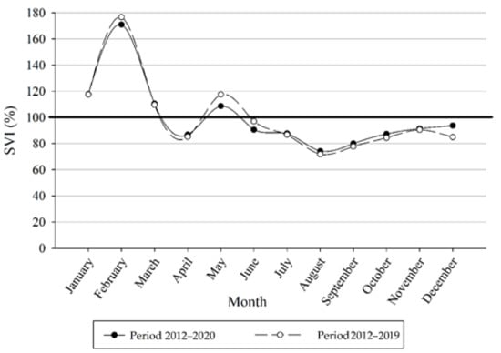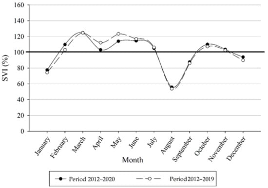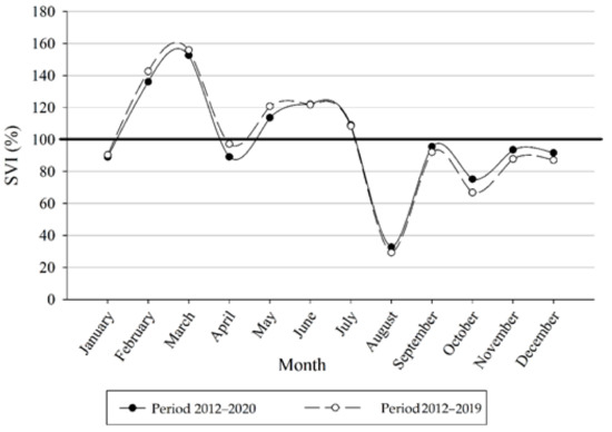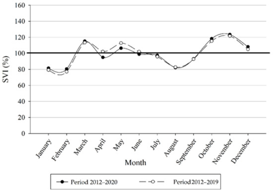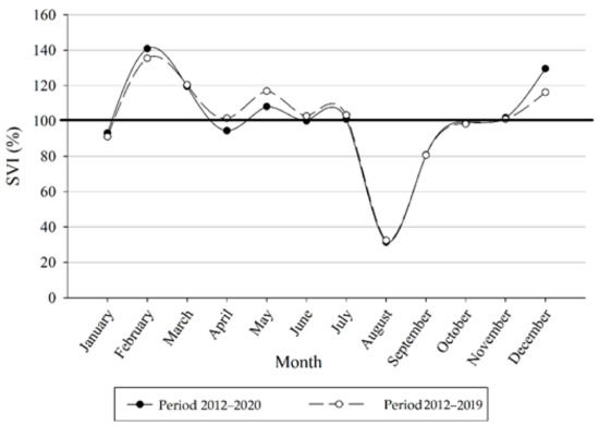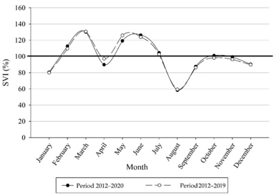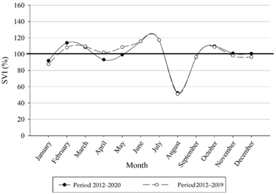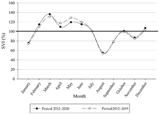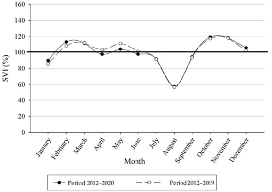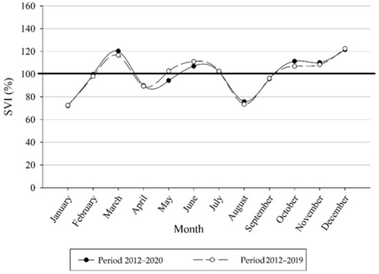 Then, in April and May, the COVID-19 pandemic impact was clear. When the SVI index from the 2012 to 2020 period is compared with the 2012–2019 period, both disembarking and embarking traffic suffered losses. This tendency was reported by different organizations. For instance, EMSA [16] noted losses in the same period in all maritime traffics.