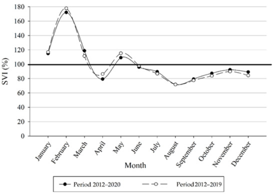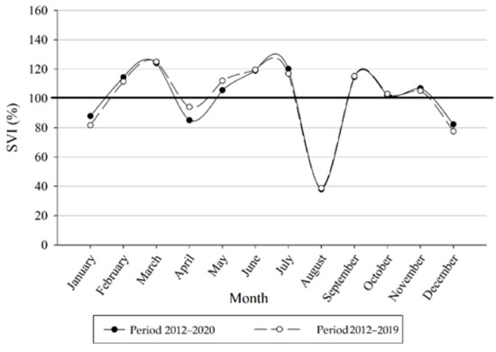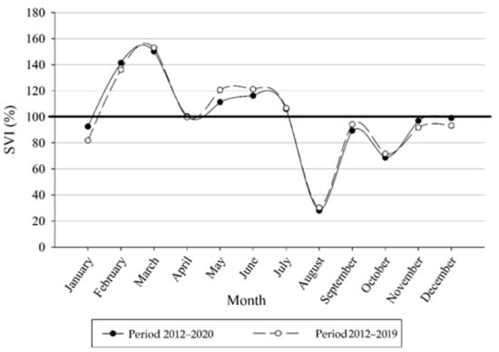 The month of June presents different behavior for embarking and disembarking traffic. Regarding disembarking, SVI in the period of 2012–2020 shows a minor activity compared with the period of 2012–2019 for all the ports analyzed, as can be noted in Figure 9, Figure 10, Figure 11, Figure 12, Figure 13, Figure 14, Figure 15, Figure 16, Figure 17, Figure 18, Figure 19, Figure 20, Figure 21 and Figure 22. For instance, for the ports of Barcelona, Santander, Setúbal and Valencia more than 50% of the total losses of 2020 in embarking traffic were registered during the period from April to June. April and May were the months of the year with loss of traffic for the port of Vigo. The biggest loss was registered by the port of Valencia with 65% of the total losses. Similar results were obtained for the disembarking traffic. In most cases the second trimester of the year concentrated more than the 40% of the total losses. In this case, the ports of Valencia and Setubal highlight with a loss of 57 and 54%, respectively.