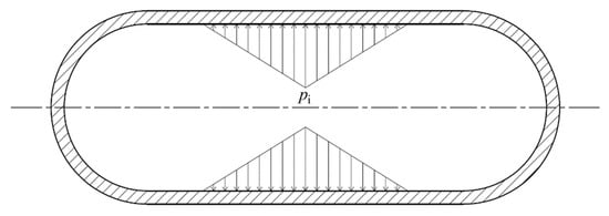 The method of center initiation [19] is usually used in experiments of explosive loading for cylindrical shells, in which trinitrotoluene (TNT) is installed in the geometric center of the cylindrical shell [20]. According to the theory of explosion dynamics, the strength of a shockwave decreases with the increase in the distance from the explosion point. In addition, deformation occurs in a limited range from the charge center along the axial direction of the shell [21]. In our mechanical model, the explosive load is approximately regarded as a spindle-shaped load. The load at the initiation point is the largest, and the load on both sides of the axial direction is inversely proportional to the distance from the initiation point. The spindle-shaped load acting on both ends of the vessel is ignored.