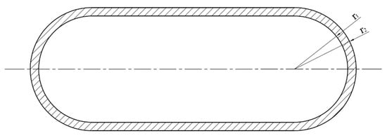 Figure 3 demonstrates the shape and dimensions of the cylindrical shell, which consists of a cylindrical shell and two hemispherical covers at the ends; r1 and r2 are the inner and outer radius of the cylindrical shell, respectively. In addition, any defect is ignored in the geometric model. The material of the cylindrical shell analyzed in the literature was ASTM A-106 B steel; this type of steel also contains other elements, including C (0.17%), Mn (0.77%), P (0.010%), S (0.025%), and Si (0.25%). ASTM A-106 B steel corresponds to “MAT Type 24, piecewise linear isotropic plasticity model” in LS-DYNA. This material model can reflect the elastic–plastic properties of materials.