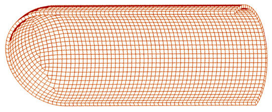 The geometric structure and the load of the cylindrical shell are axisymmetric. To reduce computational cost, 1/4 models shown in Figure 5 are established for the finite element analysis. Through mesh sensitivity analysis, the size and number of elements of the model are determined, and the influence of different modeling parameters on the prediction of burst pressure is minimized. In this finite element model, the length (excluding the caps) is double the outer diameter of the cylindrical shell. The element type adopts eight node hexahedral elements, the aspect ratio is 1.35, the inner layer has 35 elements along the half-circumference, and the span of each element is ~5.1°. The blast failure criterion of the finite element analysis is based on the maximum plastic strain at different strain rates. Under the action of load, when the plastic strain of the element reaches the preset maximum value, the element is considered to be invalid, and is subsequently deleted. When the element is deleted, it means that the cylindrical shell has burst. In the output file of the finite element analysis, the time and pressure of the blast are recorded. The results are listed in Appendix A.