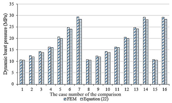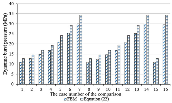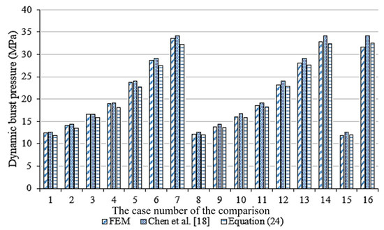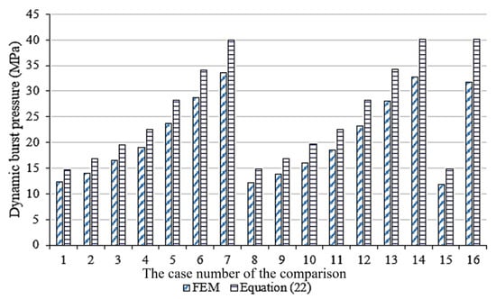 When the cylindrical shell is subjected to explosive load until burst, the spike duration of dynamic pressure pulse td will be shorter than the dynamic burst time tb. The latter is recorded in the solution output file, and can be obtained by post-processing, as shown in Appendix A. The maximum dynamic strain of ASTM A-106B steel is 0.262, and its static ultimate tensile strength σb is 413.7 MPa. Substituting these parameters into Equation (22), the dynamic blast pressure of the cylindrical shell can be calculated.