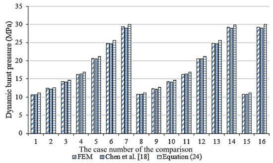 At the same time, the results obtained via the optimized dynamic blast pressure Equation (24), compared with the model proposed by Chen et al. [18], are shown in Figure 9, Figure 10 and Figure 11 when td = 3.9 ms, 39 ms, and 390 ms, respectively. Figure 9, Figure 10 and Figure 11 contain 16 cases for comparison. The parameters that determine the comparison results are listed in Table A4, Table A5 and Table A6 of Appendix A, while Figure 9, Figure 10 and Figure 11 only show the comparison results. The errors between Equation (24) and the FEM are greatly reduced, and most of the errors are less than 5%. Compared to the calculation by Equation (22), the accuracy is greatly improved. In addition, while ensuring the accuracy close to that of the prediction method in Chen et al. [18], the structure of Equation (24) is more concise. Equation (24) is a semi-empirical equation for the dynamic blast pressure of cylindrical shells subjected to explosive loads, and is able to meet the engineering requirements.