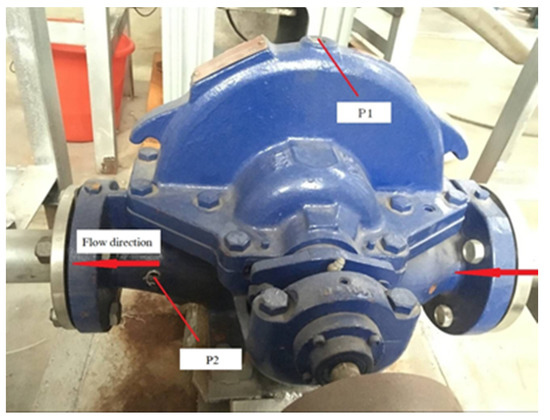 A ballast pump was chosen as the research object, with the design parameters of a flow rate Qd = 32.6 m3/h, head H = 15.3 m, rotating speed n = 1450 r/min and the specific speed ns = 46. Its main geometric parameters are shown Table 1. As shown in Figure 1, the top and the outlet of the volute were chosen as monitoring points to monitor the inner dynamic pressure, respectively named as P1 and P2.