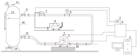 Sketch diagram of the experimental system for rapid reduction of flow rate. 1 Model pump, 2 Pressure sensor, 3 PLC controller, 4 Data collection systems, 5 Computer, 6 Electromagnetic flowmeter, 7 Pneumatic control valve, 8 Air compressor, 9 Backwater valve, 10 Water tank, 11 Vent hole, 12 Inlet hole, 13 Level gauge, 14 Drain valve, 15 Water outlet valve, 16 Base.