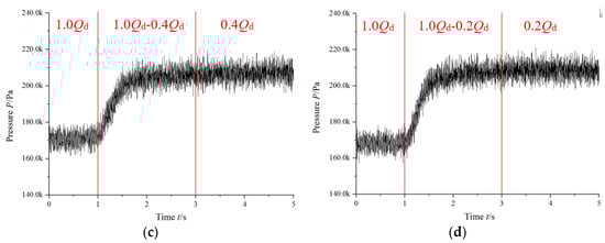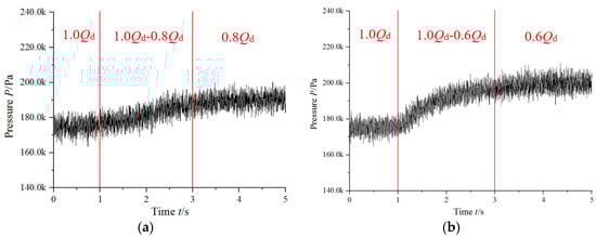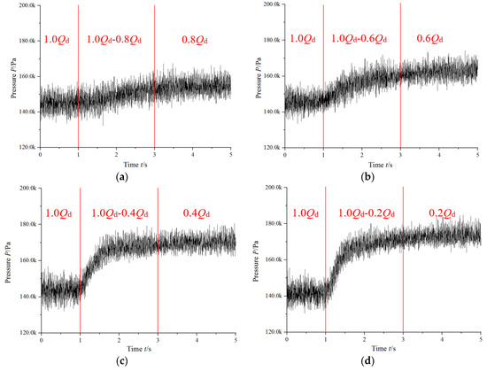 Figure 4 shows the time domain of the dynamic pressure at P1 for each study scheme of the rapid changing condition. The pressure at P1, located at the top point of the volute, has an increasing trend, with the rapid increase in pressure is completed within 2 s. The pressure and its amplitude show different trends during the rapid changing of the flow rate. While the flow rate changes rapidly from 1.0× Qd to 0.8× Qd, the pressure at P1 gradually increases. As the amplitude of the decreasing flow rate increases, the pressure at P1 shows firstly a rapid increase and then a slow increase. The times of rapid increase are 1.2 s, 0.8 s and 0.6 s, respectively, which means that the larger the amplitude of the flow rate change is, the faster the pressure increases.