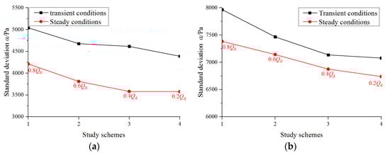 The standard deviation of the dynamic pressure is chosen to measure the steady pressure fluctuation and the standard deviation of the dynamic pressure of each transient condition and steady condition, which were 0.8× Qd, 0.6× Qd, 0.4× Qd and 0.2× Qd, respectively, to analyse the steady dynamic pressure in the pump. The statistical data are shown in Figure 6. It can be seen from Figure 6 that the standard deviation of the dynamic pressure after the transient conditions of P1 and P2 is higher than the corresponding steady-state operating conditions. Meanwhile, the rapid change in flow leads to an increase in the amplitude of pressure pulsation, and enhances the internal turbulent flow characteristics. With the increase in flow rate change, the standard deviation of the dynamic pressure after the transient conditions becomes smaller and smaller. The rapid decrease in flow rate causes the relative velocity of the fluid in the impeller to decrease, and the effect of the dynamic and static interference between the fluid and the volute is weakened, which results in a decrease in the intensity of dynamic pressure pulsation.