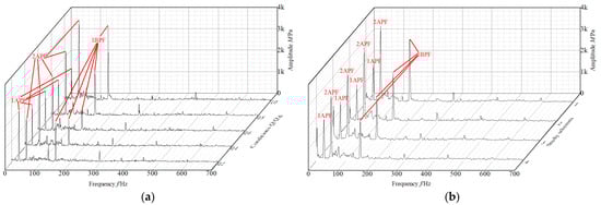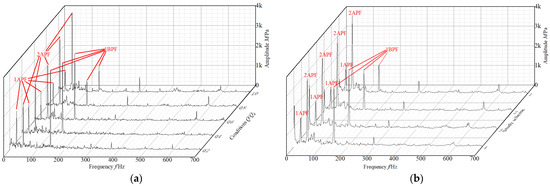 Figure 7 shows the dynamic pressure frequency distribution of each of the steady-state and transient conditions at P1. It can be seen that the pulsation of dynamic pressure in transient, and the steady-state conditions are mainly distributed at 0~300 Hz, with the main pulsating frequencies being 1APF, 1BPF and their harmonic frequencies; there is a broadband frequency between the 2APF and 1BPF band. Therefore, the asymmetric structure of the spiral volute and the dynamic and static interference between the impeller and the inner wall of the volute are the main factors that cause the dynamic pressure pulsation inside the volute.
