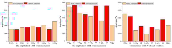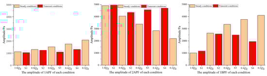 Figure 10 shows the amplitudes of each pulsation frequency of dynamic pressure at P2. It can be seen that with the increase in flow rate reduction, the amplitude of 1APF fluctuates slightly, but the amplitude of the frequency of each research scheme is lower than the corresponding steady-state operating conditions after the transient conditions. The amplitude of 2APF first decreases and then increases. The amplitude of the frequency of each research scheme is lower than the corresponding steady-state operating condition after the transient condition ends. The amplitude of 1BPF first increases and then decreases, and the amplitude of the frequency of each research plan is lower than that after the transient condition ends.