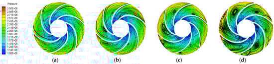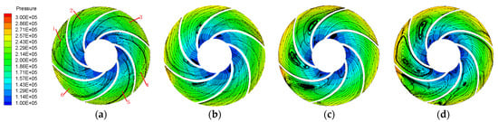 The pressure and streamline distribution in impeller under steady conditions (a) 0.8× Qd, (b) 0.6× Qd, (c) 0.4× Qd and (d) 0.2× Qd.